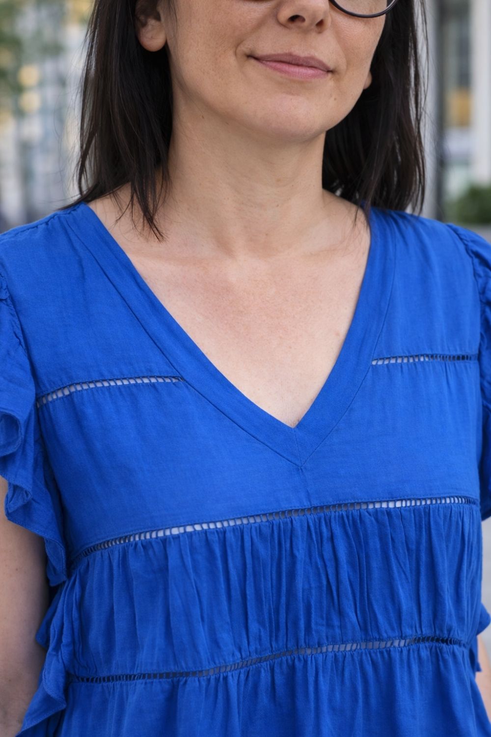 Bluzka damska niebieska boho falbanki zwiewna M