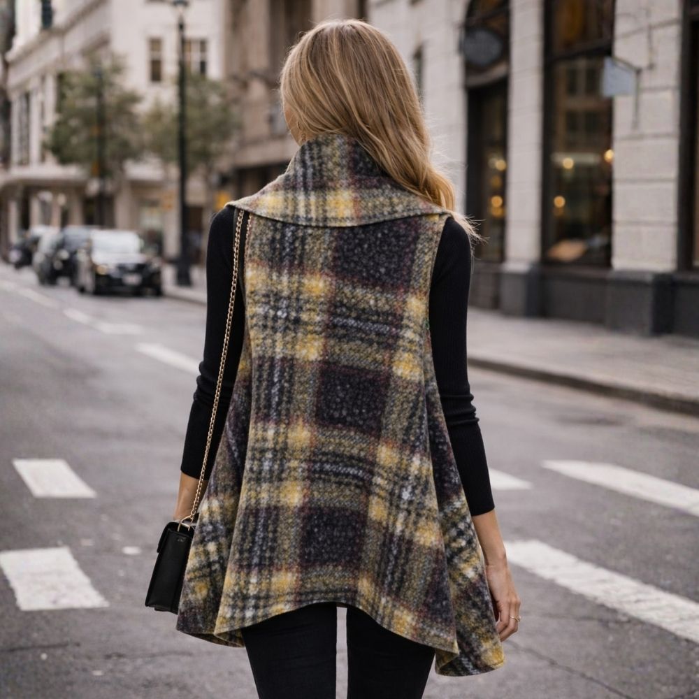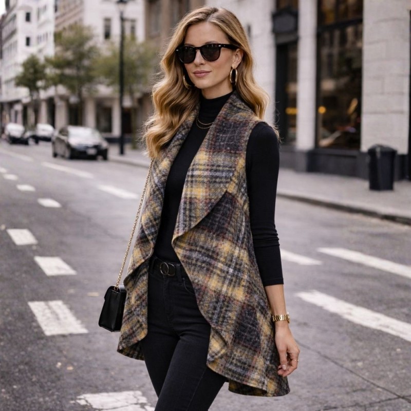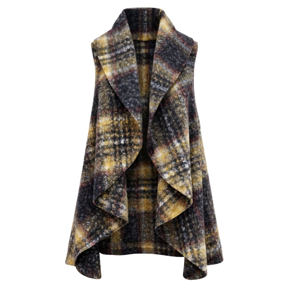 Kamizelka Narzutka Damska Długa w Kratę Ciepła Bez Rękawów Jesień Uni