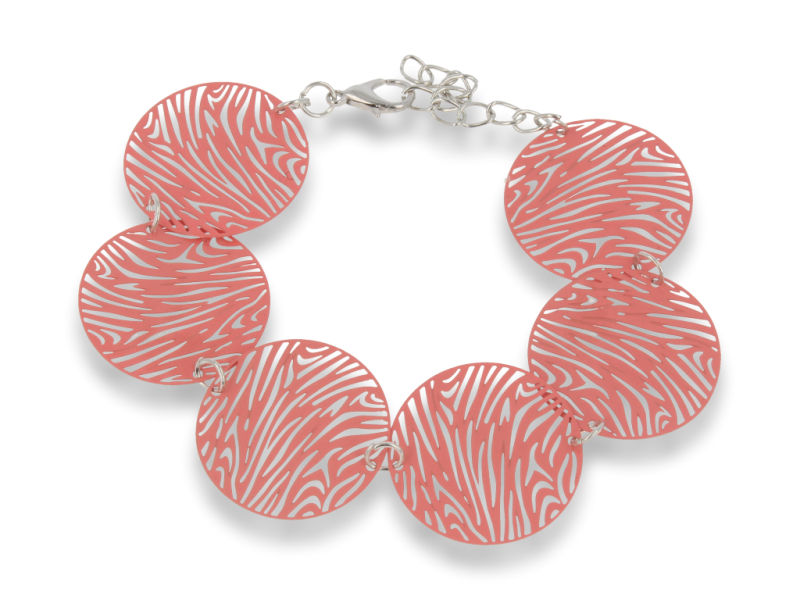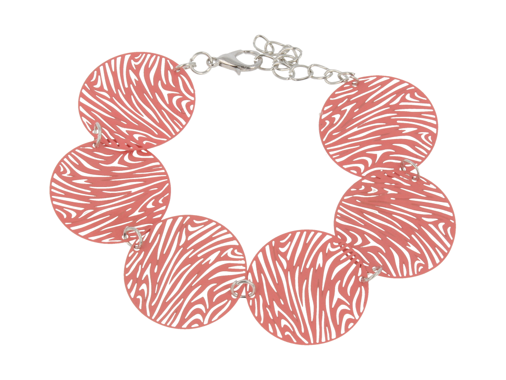 Bransoletka wykonana z cieniutkich metalowych listków z ażurowym motywem. Każdy listek o średnicy 2,5 cm. Idealnie dopełni strój do pracy i na wieczorne spotkanie z przyjaciółkami. Mając taką piękną bransoletkę na ręce poczujesz się pewnie, elegancko i kobieco.