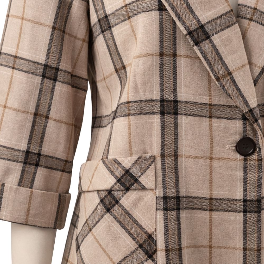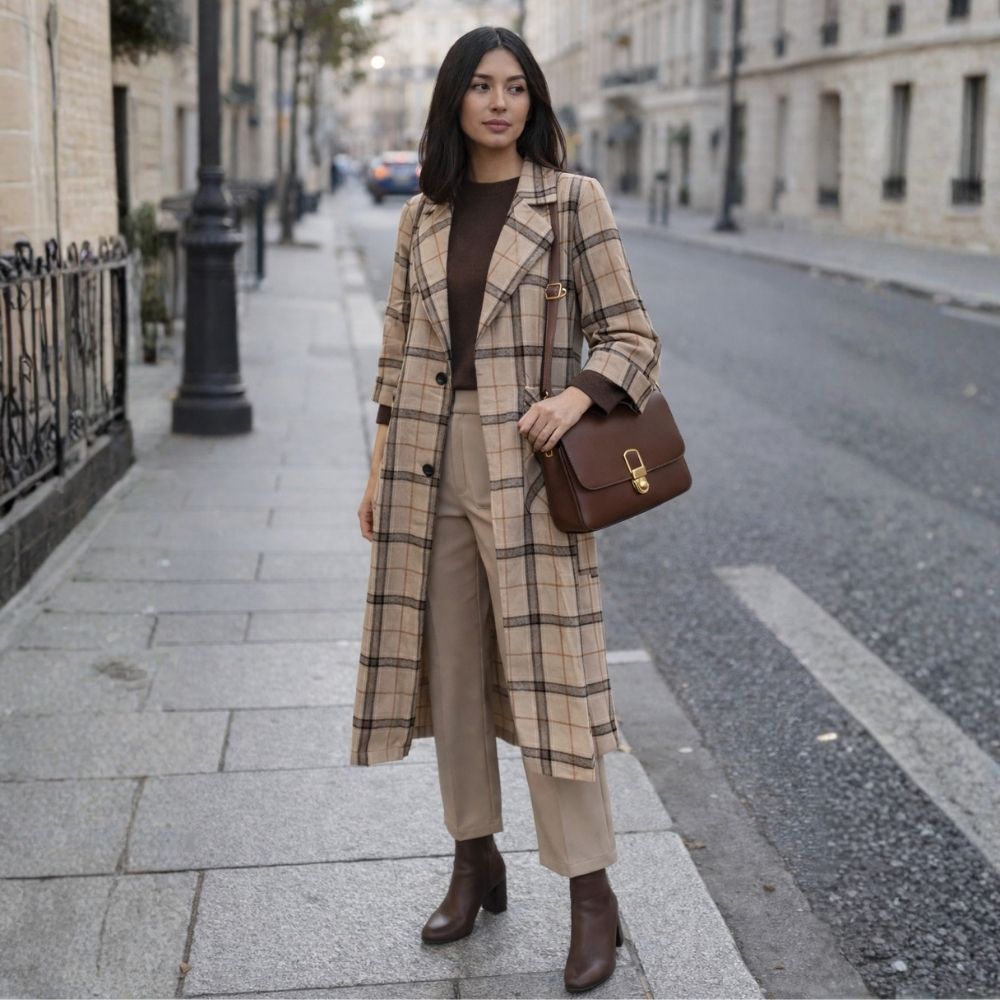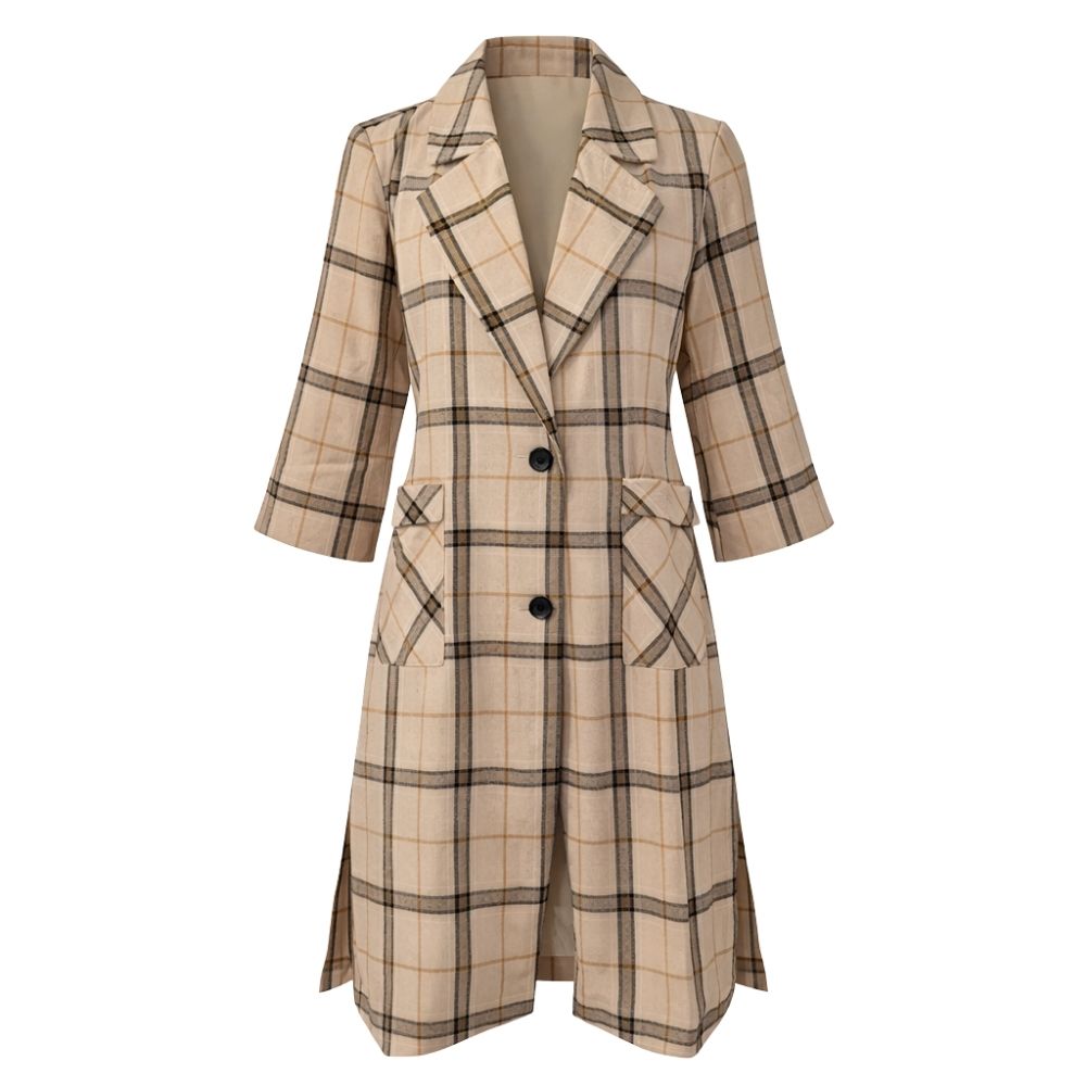 Płaszcz Damski Koszulowy w Kratę Oversize Beżowo-czarny długi One Size