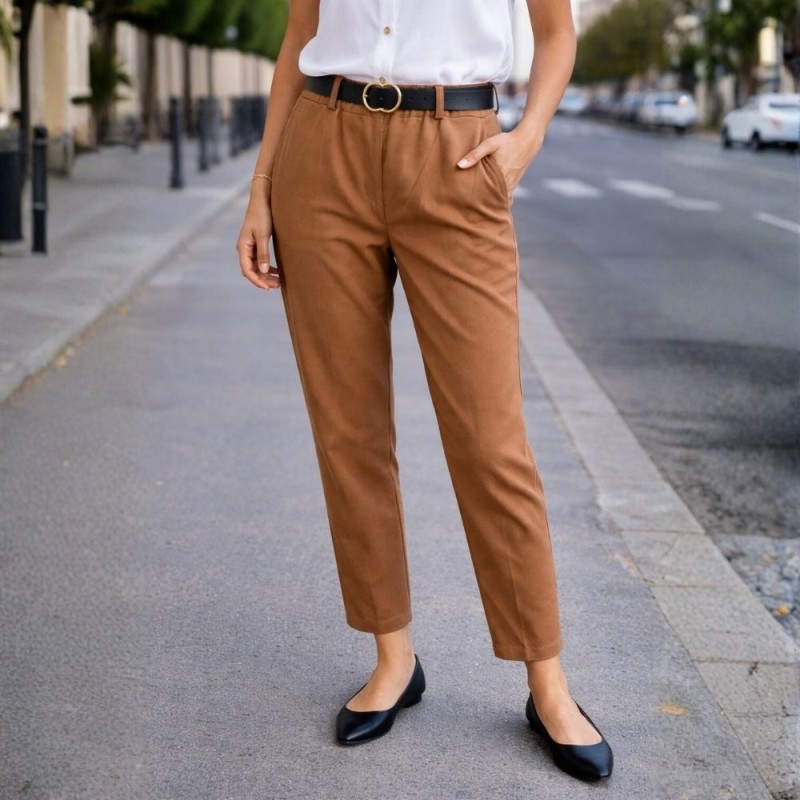 Wykonane z gładkiego materiału w odcieniu ponadczasowego brązu, zachwycają strukturą oraz matowym wykończeniem, które nadaje całości szlachetnego wyrazu. Prosty krój z elastycznym pasem i stylowym paskiem z klamrą zapewnia sylwetce nienaganne proporcje oraz wygodę. Praktyczne kieszenie i minimalistyczny design sprawiają, że spodnie te stanowią doskonały fundament zarówno dla biurowych, jak i weekendowych zestawień.