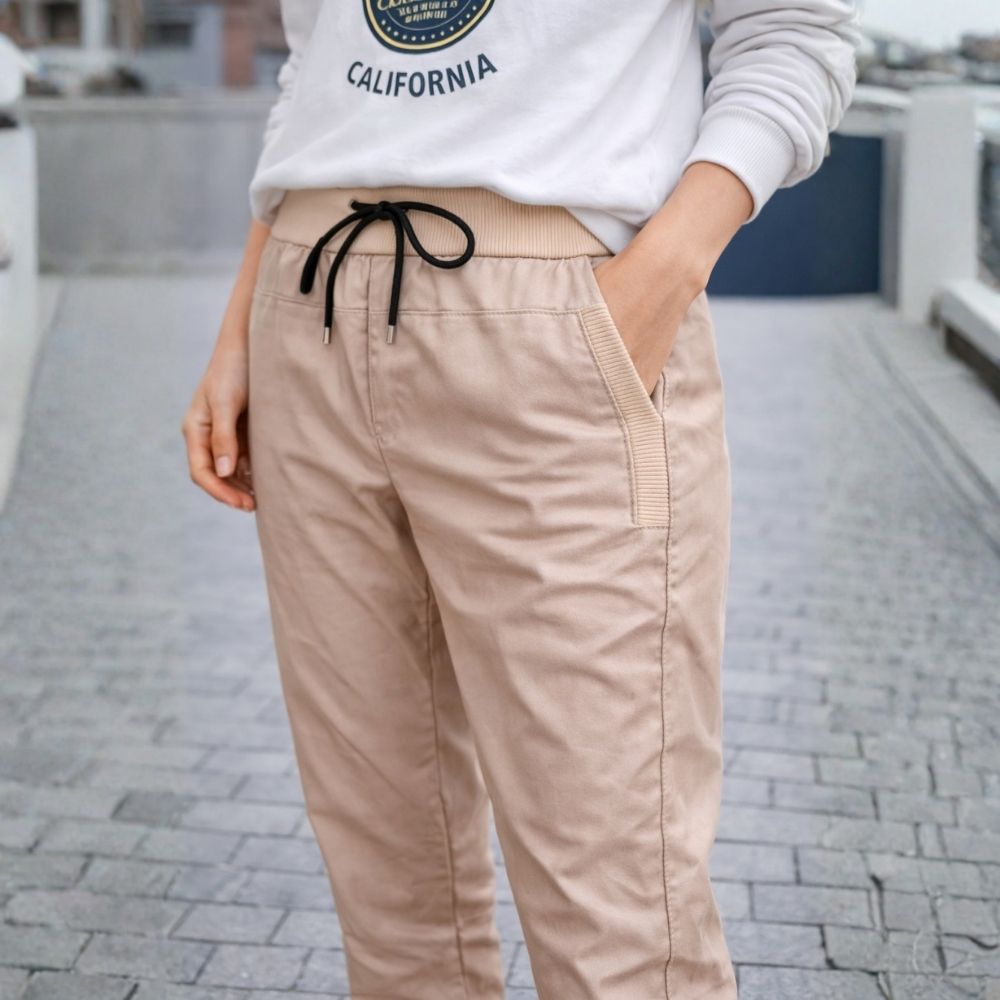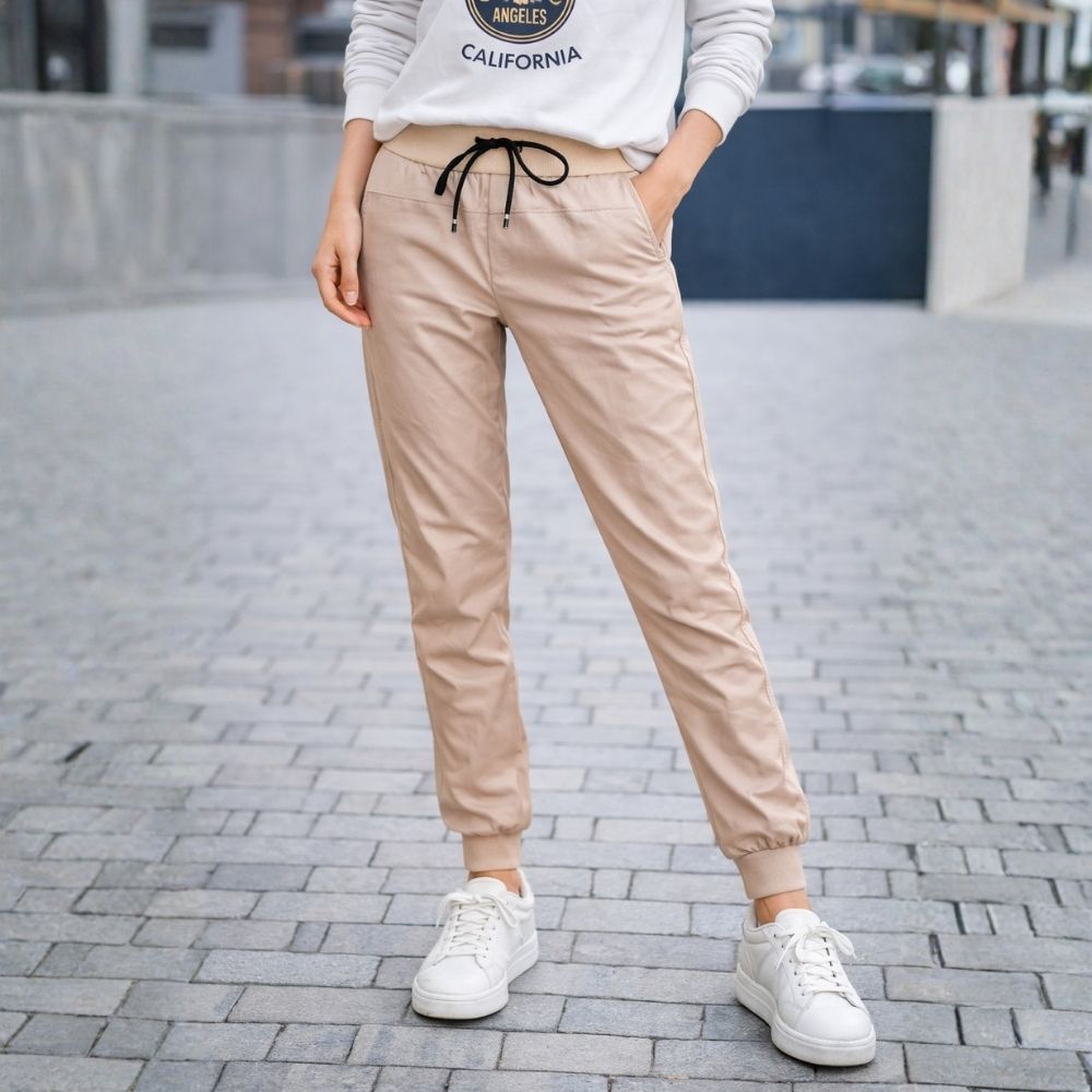 Wykonane z materiału o eko-skórkowym wykończeniu, zachwycają odcieniem stonowanego beżu i efektownym połyskiem, który nadaje im niemal futurystycznego charakteru. Krój typu jogger z delikatnie zwężanymi nogawkami wykończonymi prążkowanymi ściągaczami zapewnia sylwetce nowoczesne proporcje i lekkość.