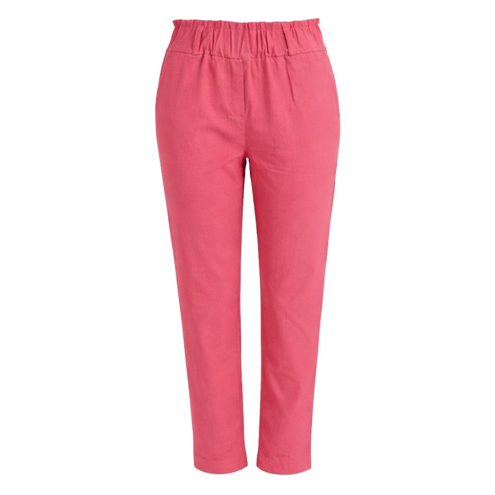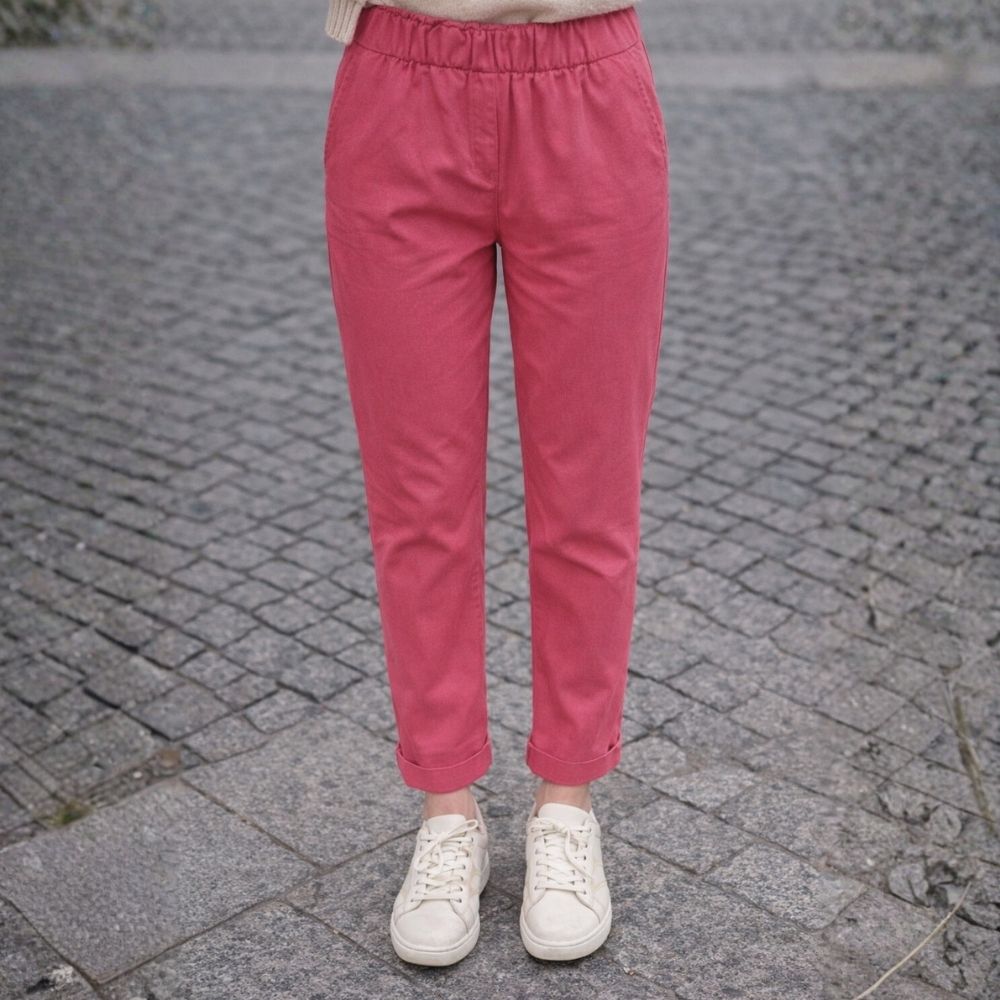 Wykonane z solidnego materiału w nasyconym koralowym kolorze, zapewniają trwałość i wyrazisty wygląd. Fason z elastycznym wysokim stanem oraz prostą nogawką świetnie podkreśla talię, gwarantując jednocześnie pełną swobodę ruchów. To uniwersalna baza, która doskonale ożywi zarówno biurowe zestawy, jak i codzienne, casualowe outfity.