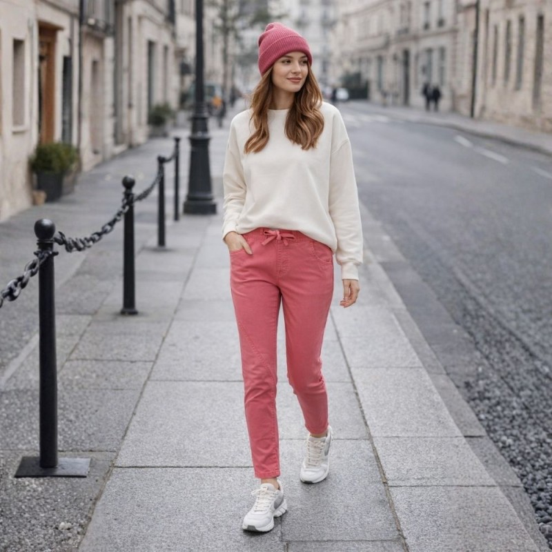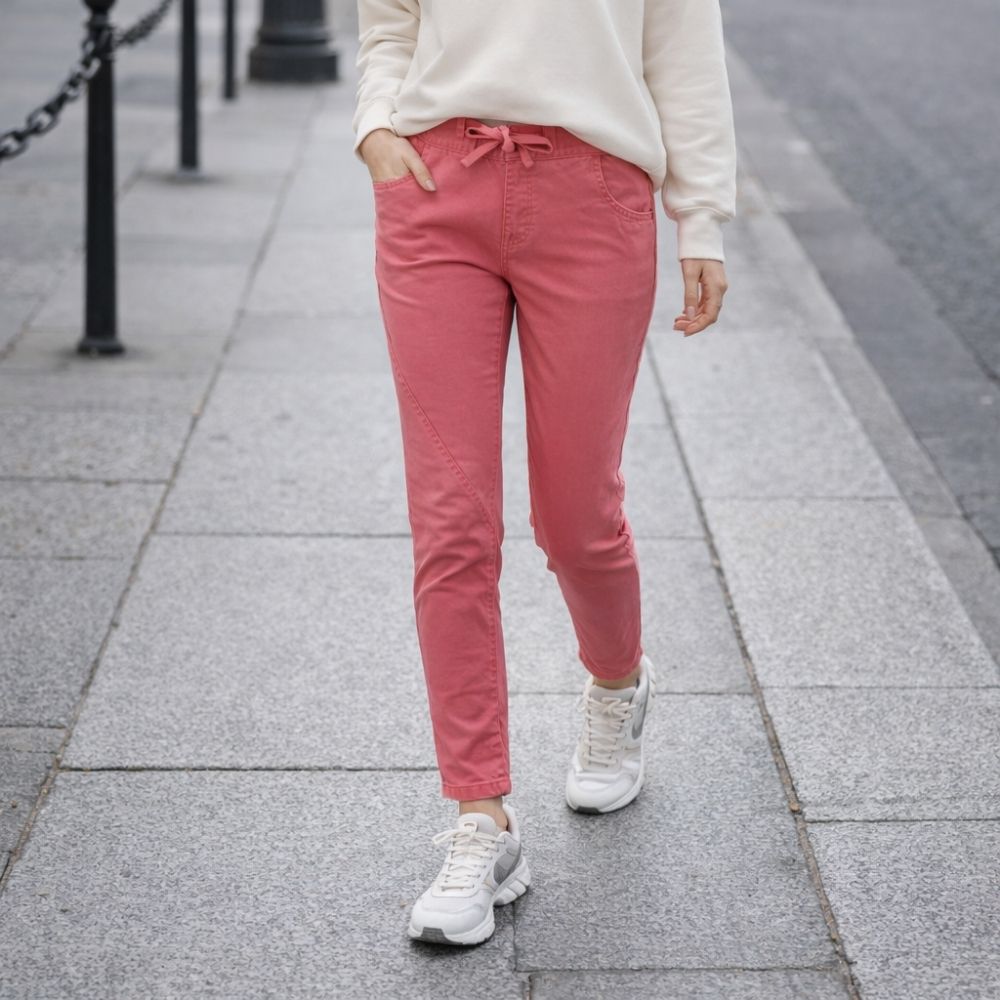 Wykonane z solidnego materiału w nasyconym różowym kolorze, zapewniają trwałość i wyrazisty wygląd. Fason z elastycznym wysokim stanem oraz prostą nogawką świetnie podkreśla talię, gwarantując jednocześnie pełną swobodę ruchów. To uniwersalna baza, która doskonale ożywi zarówno biurowe zestawy, jak i codzienne, casualowe outfity.