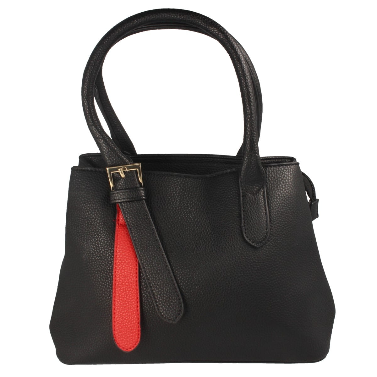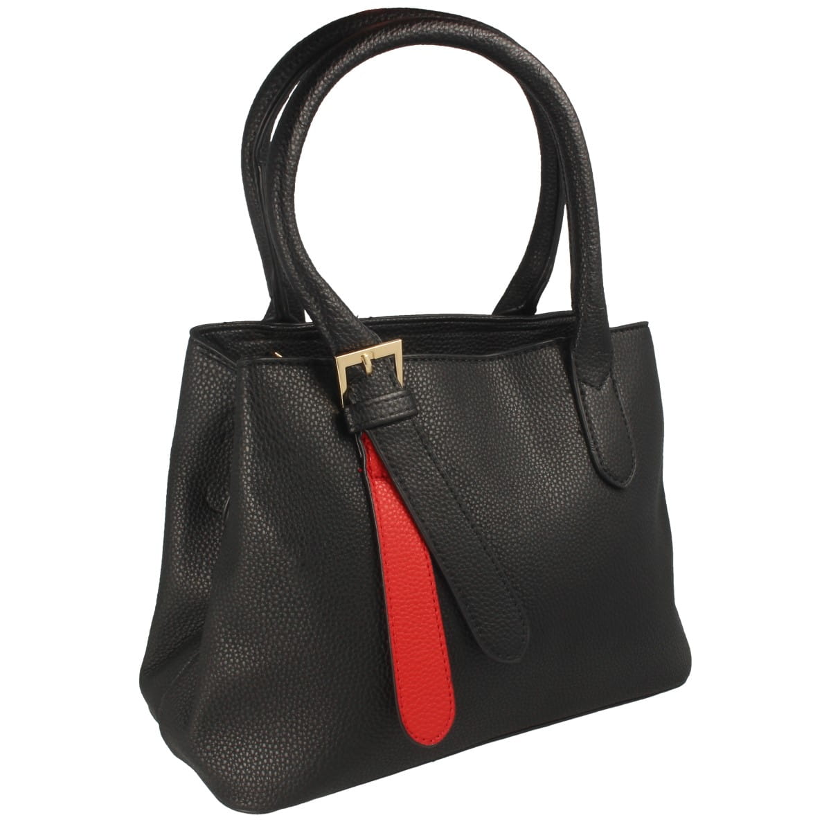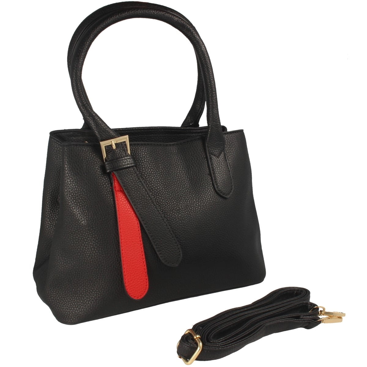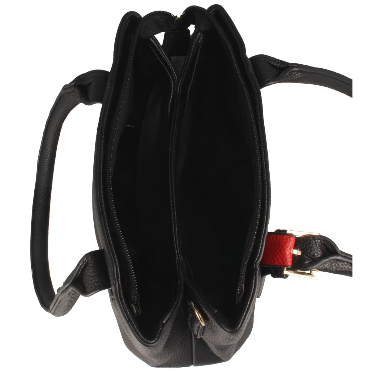 Torebka damska w fasonie klasycznym, w kolorze czarnym z wstawką w kolorze czerwonym. Model wykonany z materiału syntetycznego.