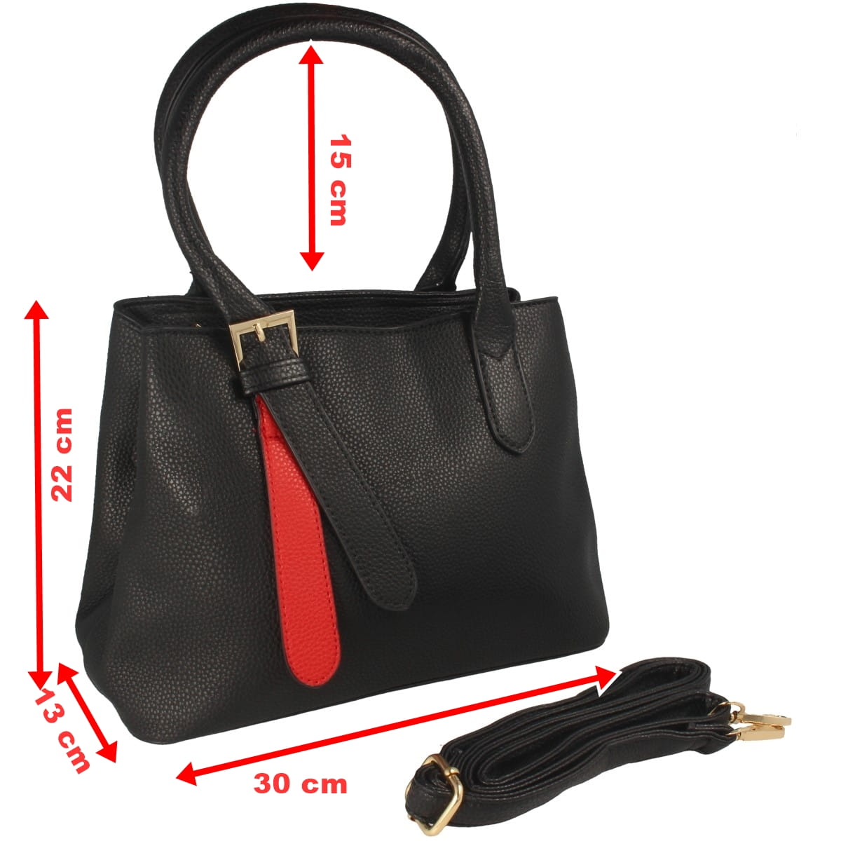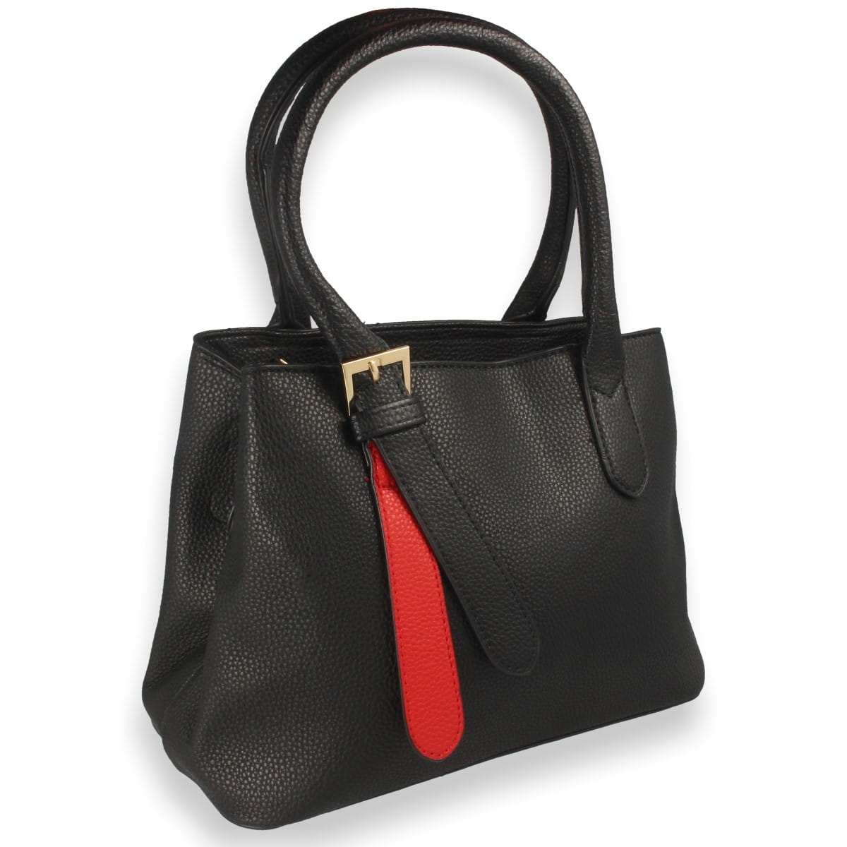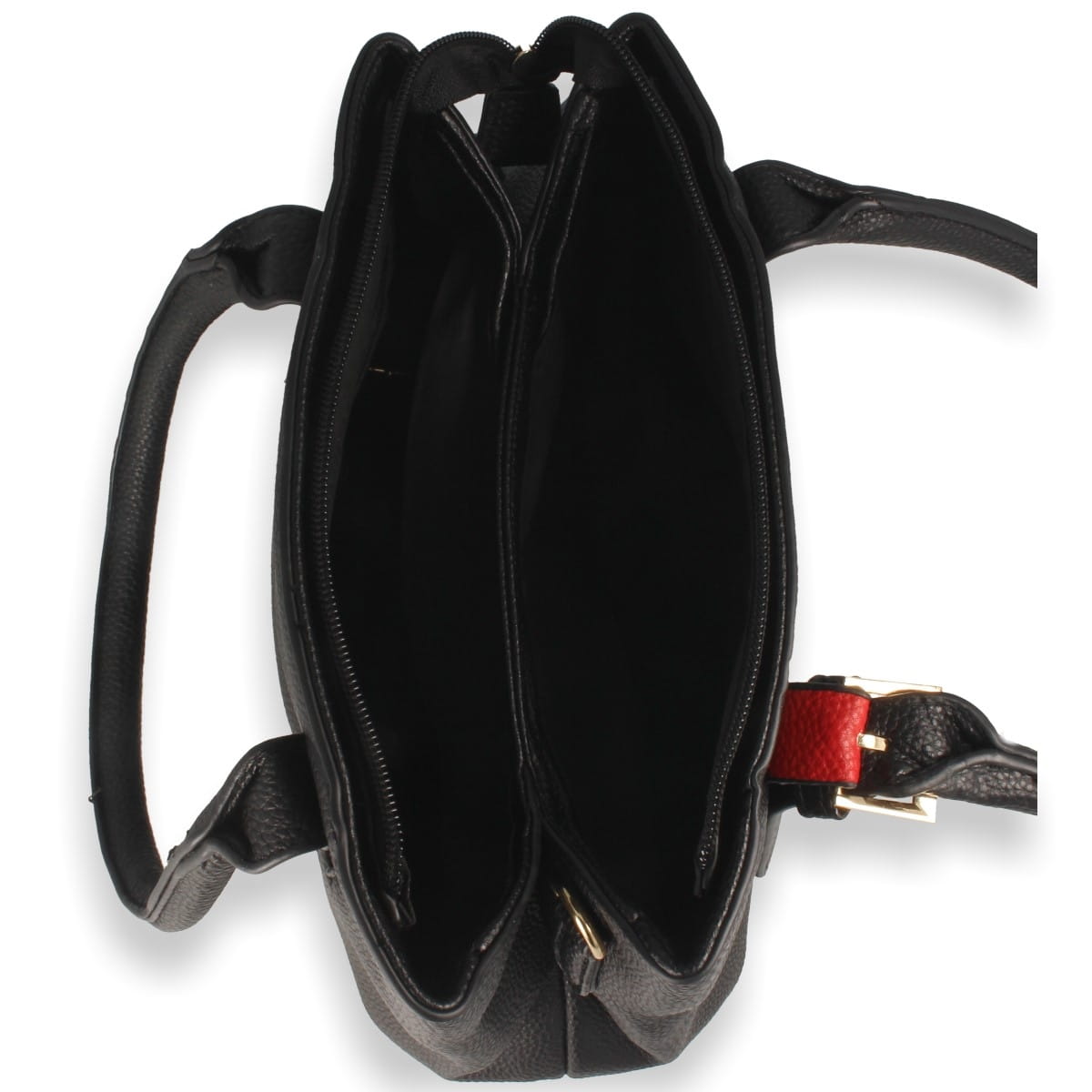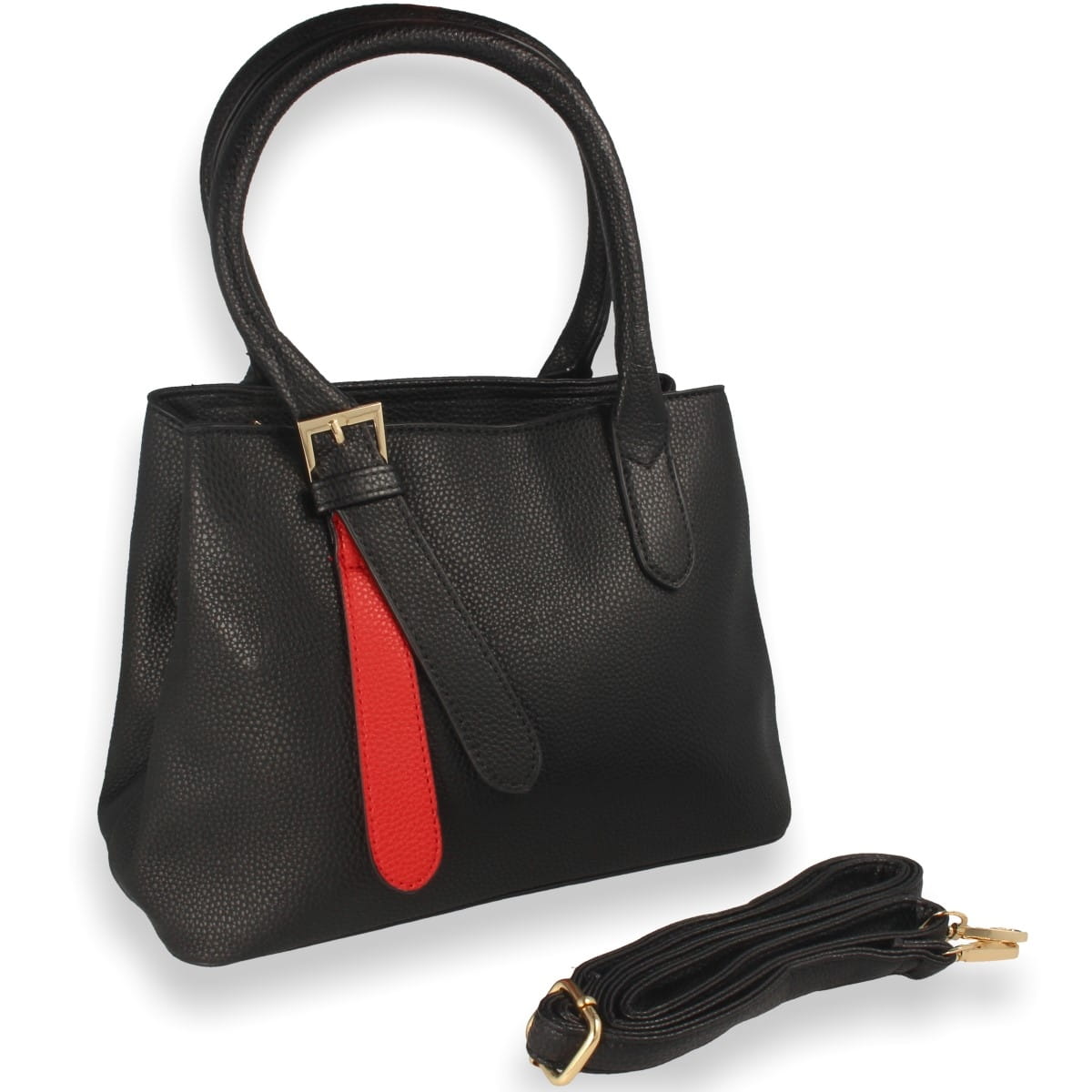 Torebka damska w fasonie klasycznym, w kolorze czarnym z wstawką w kolorze czerwonym. Model wykonany z materiału syntetycznego.